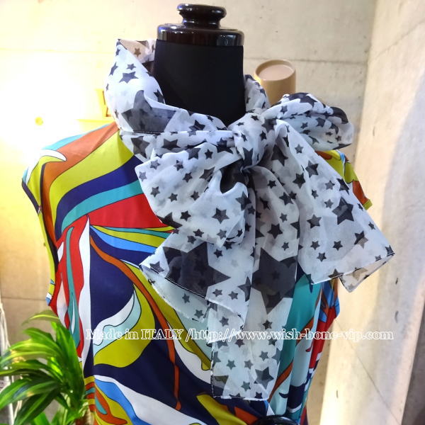 皆さんに良く聞かれる『胸元のチラ見え』をどう隠すか。中に何か着たら良いのですが、お顔まわり、こんな『軽る〜いスカーフ』をアクセ感覚で巻いたり垂らしたりすると、オシャレで持ってると便利です。パーティーとかお食事などにも良いかも。