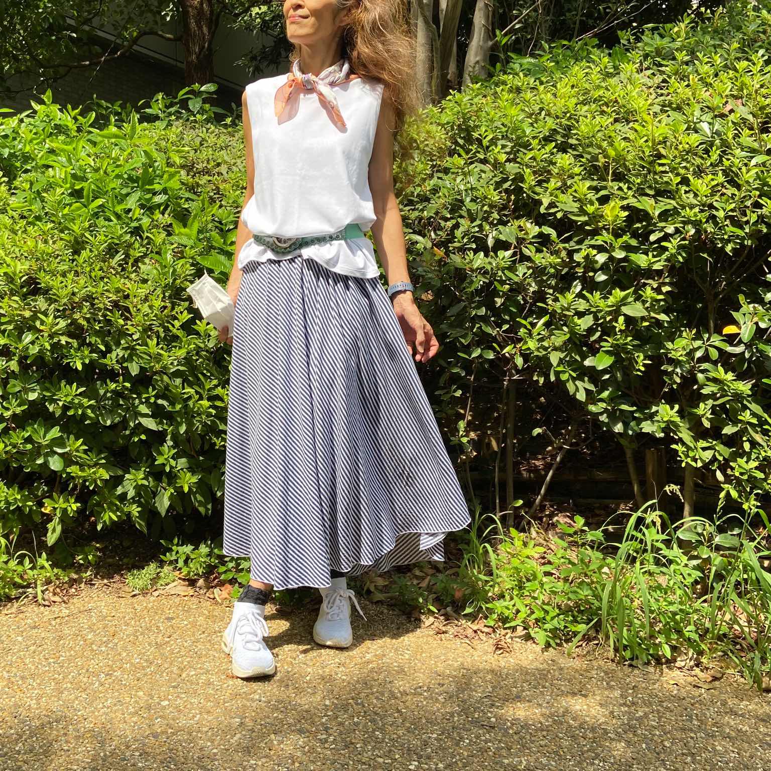 オーバーサイズのTシャツを私は合わせて、ベルトをしていますが、