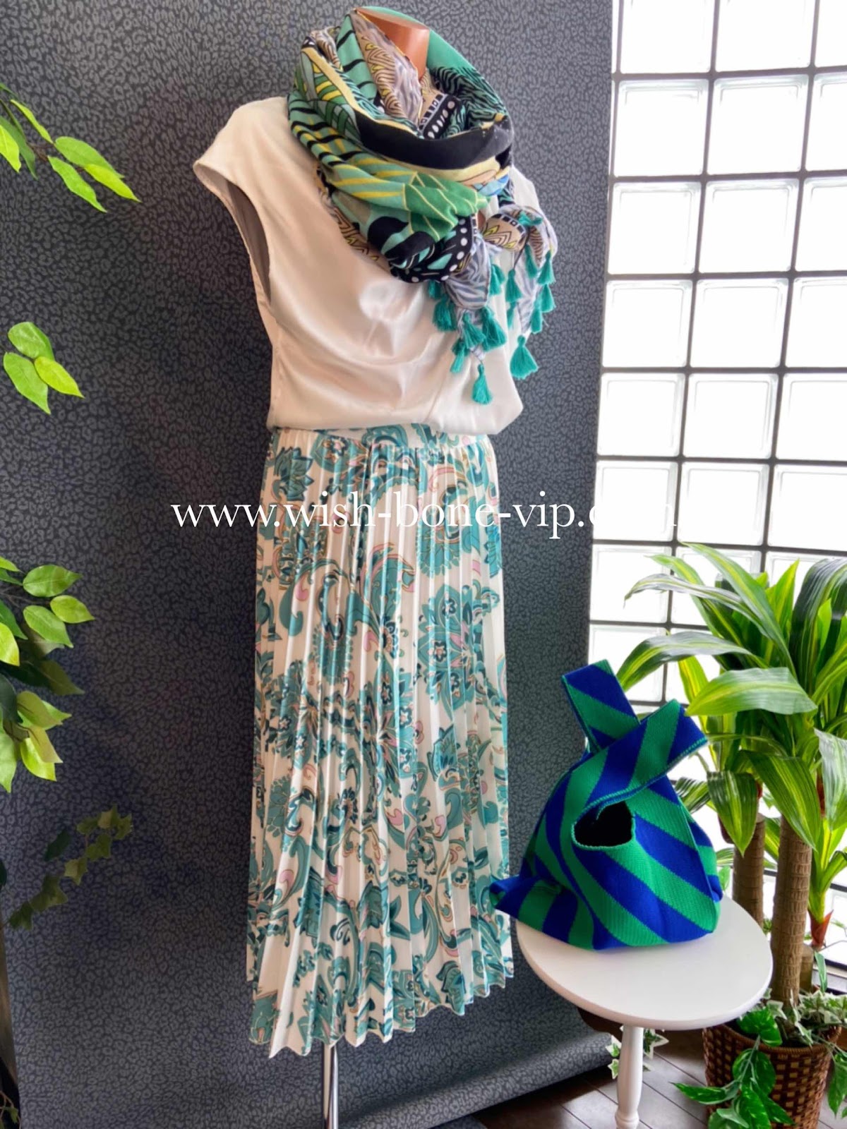 本日おすすめは、これから便利な大判のロングストールです。夏に向けて、ブルー&グリーンで爽やかコーディネートにしました。